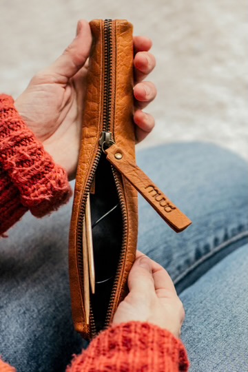 Hee XL von muud ist ein edles Lederetui, das behutsam deine Häkelnadeln und andere kleine Dinge aufbewahrt, wenn du unterwegs bist.