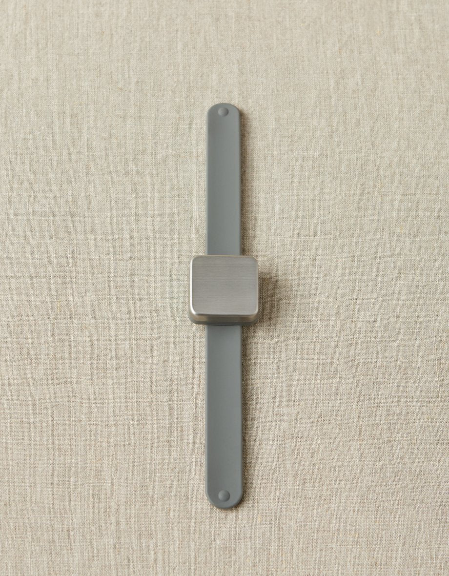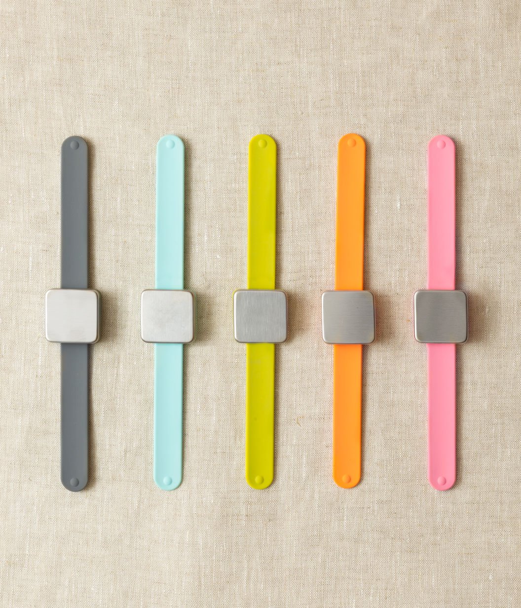 Das Armband besteht aus weichem, langlebigem Silikon und lässt sich dank „Slap“-Mechanismus flexibel an jedes Handgelenk anpassen – eine Größe passt allen. Alternativ lässt es sich ausgerollt auch als Lineal-Ersatz oder Geradehalter beim Lesen von Strickanleitungen nutzen. Der Magnet hält zuverlässig metallische Gegenstände aller Art.